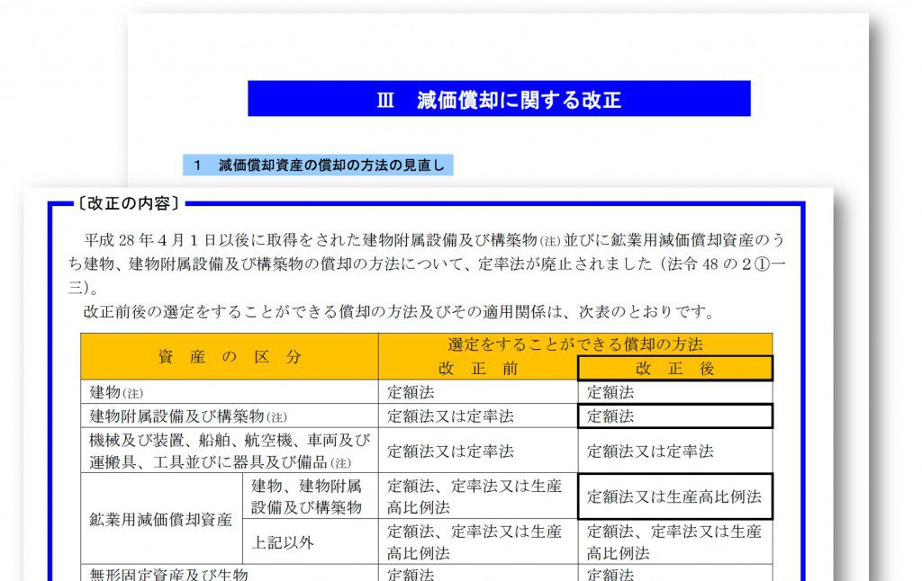 平成28年度税制改正により、建物附属設備や構築物などの減価償却方法が改正されました。