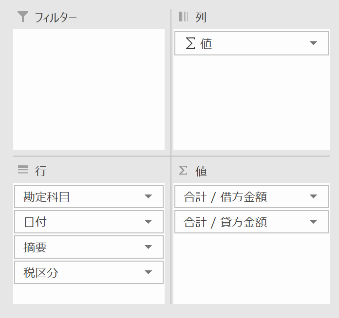会計ソフトの画面よりもピボットテーブルのほうが勘定科目の切り替えをしなくていいですし、無駄な罫線もなくシンプルでで見やすいですよね。
