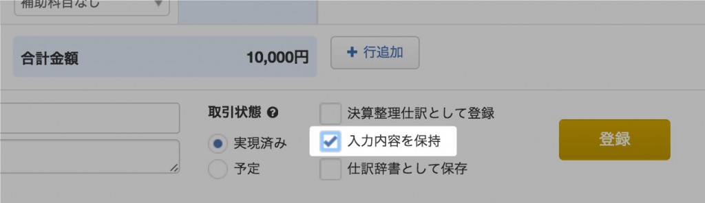 【入力内容を保持】にチェックを入れて登録すれば、次の仕訳を入力する際に、前の仕訳がそのまま残っているので、同じような仕訳を連続で入力する場合は、チェックを入れておくと便利です。